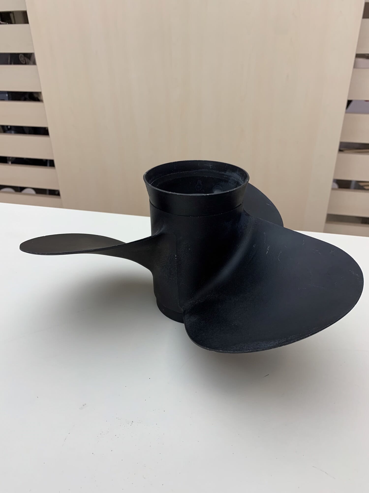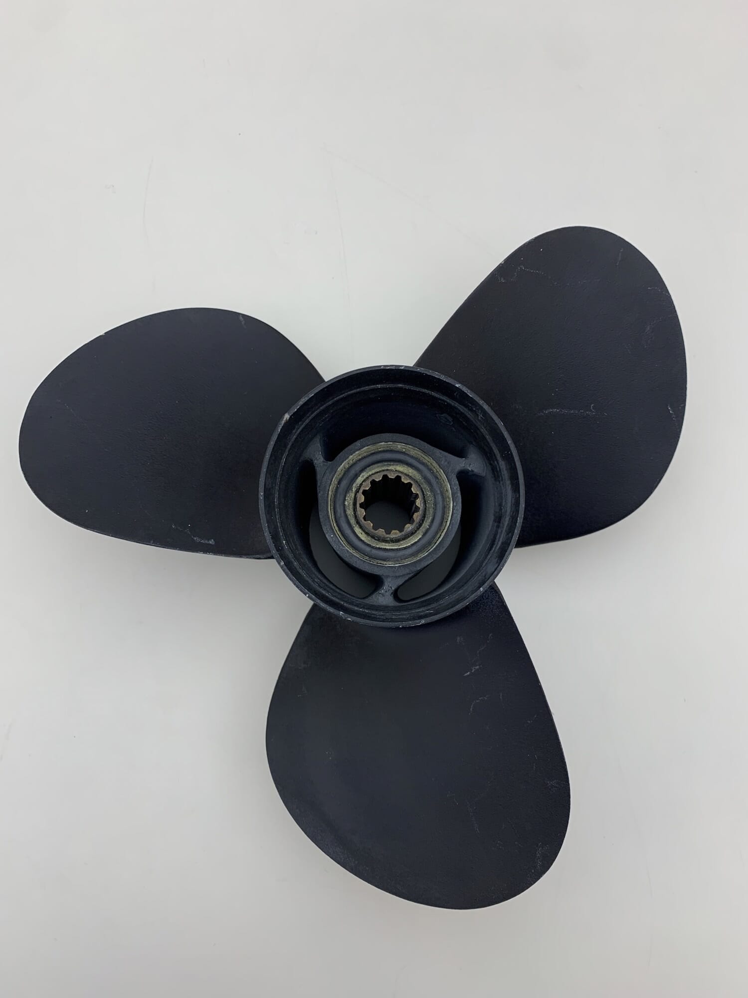 Heil og fin svart farget propell i rustfritt stål. Propellen har noen riper i lakken, samt små korrosjon på innside. Selges uten original forpakning.